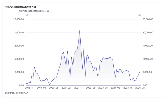 据同花顺iFinD数据,自长城汽车2018年推出欧拉品牌以来,凭借时尚化的外观设计精准切入女性消费市场,欧拉品牌迅速打开局面,产品月销量一度突破2万辆。