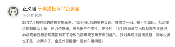 2023年11月1日,又有网友反映称,其在2023年7月初购买的欧拉黑猫新车,10月份因为刹车失灵返厂维修过一回,找不到原因,4S店要求换刹车助力器、压力传感器、继电器三个零件。