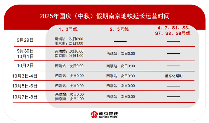 1.假期期间(9月30日至10月8日)地铁1、2、3、5号线延时运营,末班车于次日0:00自两端站发出;另为做好与主要铁路枢纽的客流衔接,9月29日至10月1日、10月7、8日,1、3号线在两端末班车0:00对发的基础上,南京南站的末班车于次日1:00发出,延时期间行车间隔为10-15分钟。