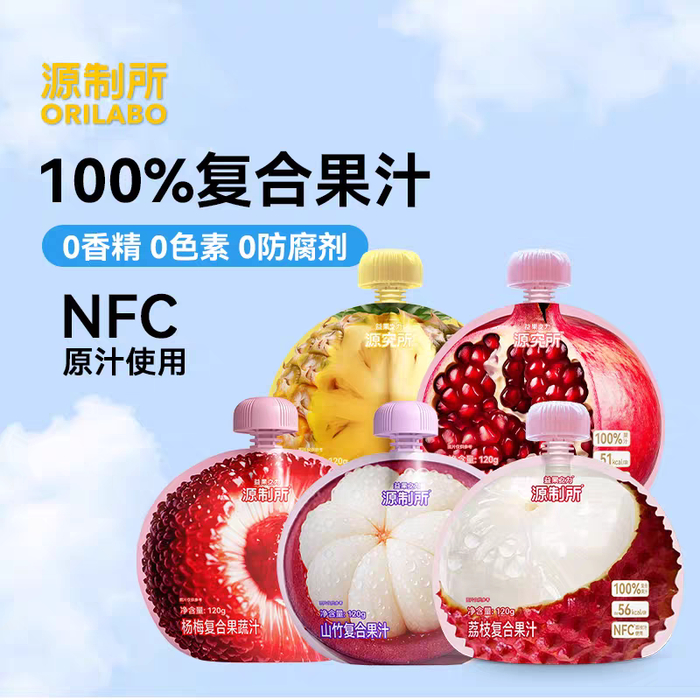源制所布局的袋装饮料以100%复合果汁为主,包括石榴汁、菠萝汁、荔枝汁、杨梅汁、山竹汁、水蜜桃汁,通过价值感的原料组建年轻化、多元化的产品矩阵。