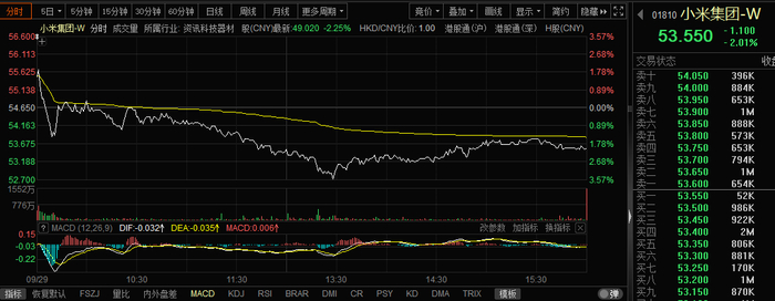《科创板日报》9月29日讯(编辑 宋子乔) 9月29日,小米集团(01810.HK)午后一度跌超3%,最终收跌2.01%。