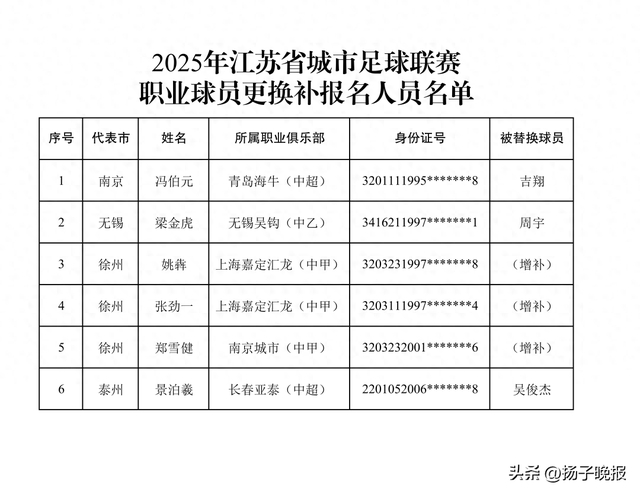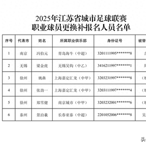 9月29日,江苏省城市足球联赛官方发布消息,根据竞赛规程,对各参赛单位职业球员更换补报人员名单进行公示。