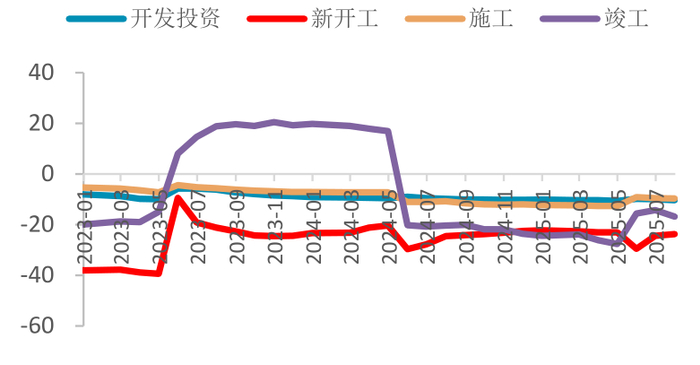 房地产方面,国家统计局的数据显示1-8月份,全国房地产开发投资60309亿元,同比下降12.9%。1-8月份,房地产开发企业房屋施工面积643109万平方米,同比下降9.3%。房屋新开工面积39801万平方米,下降19.5%。房屋竣工面积27694万平方米,下降17.0%。2025年房地产通过金融支持、财税优惠、需求激活和供给优化四大维度构建发展新模式,重点推进城市更新与住房品质升级,通过降准降息、增发超长期特别国债和安排4.4万亿元的地方政府专项债、多地调整公积金贷款政策,提高贷款额度、推出低首付等政策,整体以“止跌回稳”为核心目标,从实际的数据表现上来看,虽然新开工面积和竣工面积累计增速没有进一步下滑,但房地产前端拿地高峰已经过去,新开工和竣工面积累计依然处于15%以上的跌幅。