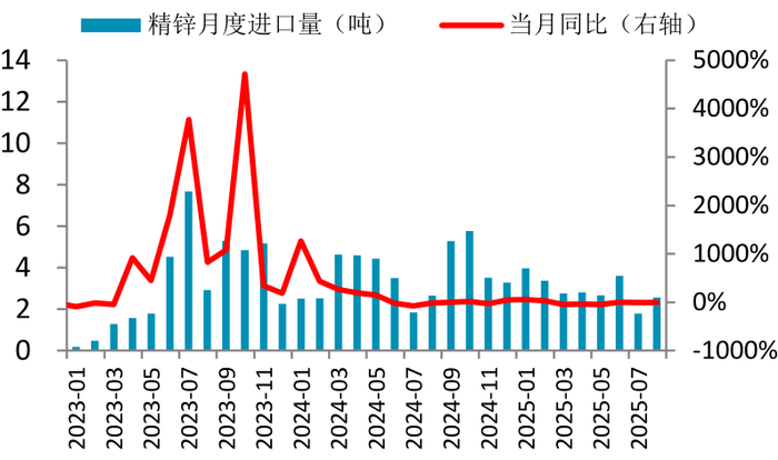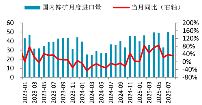 由于国内矿紧缺局势难有显著缓解,冶炼厂需采购进口矿补充原料库存。当前进口锌精矿加工费显著上涨,虽然国产锌精矿价格优势继续扩大,但前期长单或锁价锌矿持续流入,冬储阶段即将来临,冶炼厂对进口锌矿需求强劲,据海关数据显示,1-8月累计锌精矿进口量为350.27万吨(实物吨),累计同比增加43.06%。2025年国内锌精矿港口库存高企,总库存量依然维持在40万吨以上的高位,弥补了国内锌精矿增量的不足。2025年海外矿增产预期兑现+长单到货节奏改善,全年锌精矿进口量或继续增加至530万实物吨左右,同比增加120万实物吨以上。