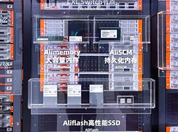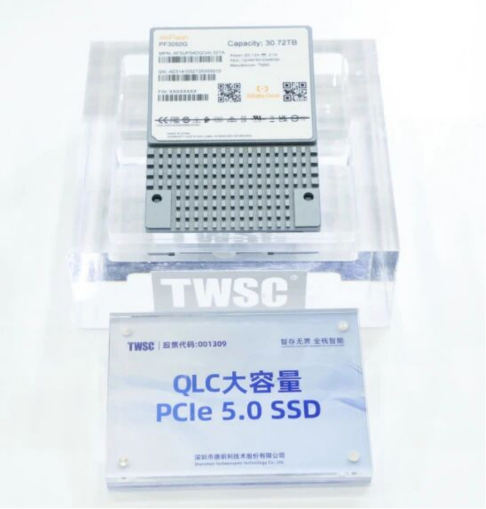 然而,AI大模型的快速发展不仅仅依赖于算力,存储能力同样至关重要。算力与存力共同构成了AI基础设施的核心。此次大会上,中国本土存储厂商德明利作为阿里云生态合作伙伴,首次展出了其面向AI应用的企业级存储解决方案,包括SATA SSD、PCIe 5.0 SSD、DDR5 R-DIMM等产品,其中QLC的大容量PCIe 5.0 SSD让人影响尤为深刻。在阿里云的自研服务器和部件展台上,德明利为阿里云定制生产的企业级SSD(eSSD)也在其中亮相(如下图),这标志着国产存储在AI产业链中“存力”这一关键环节上迈出了坚实一步。