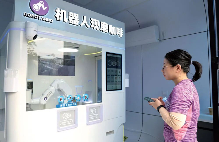 2024年12月27日,在深圳笔架山公园里,游客体验机器人现磨咖啡(梁旭/摄)