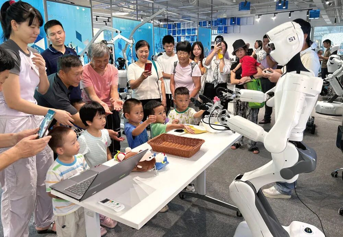 2025年7月28日,全球首家机器人6S店在深圳市龙岗区的机器人剧场开业。图为参观者在机器人6S店与机器人互动