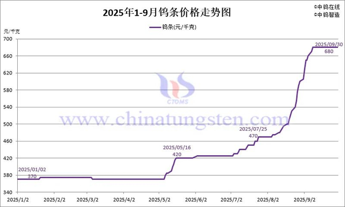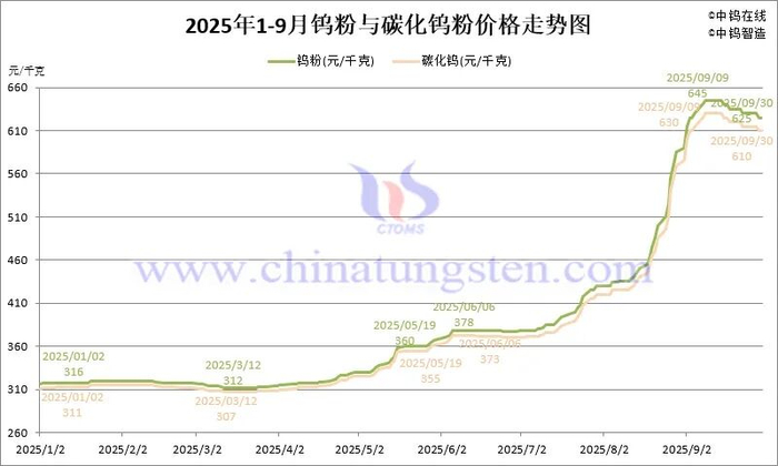 4.3 2025年1-9月份厦门钨业长单报价走势图