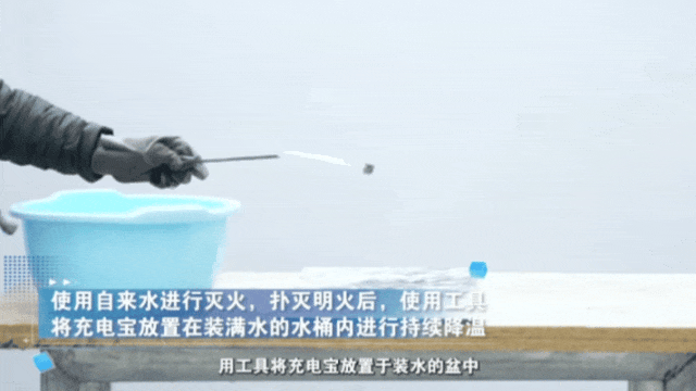 实验显示,干粉灭火器的渗透性和降温效果比较差,在应对充电宝着火时效果并不理想,而水能够渗透到充电宝内部,有效灭火并起到降温作用。因此,如遇充电宝起火,应用水灭火。