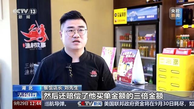 餐馆店长 刘先生:我们把他当天消费的单,作免单处理,然后还赔偿了他买单的三倍金额,大概是一千块钱。