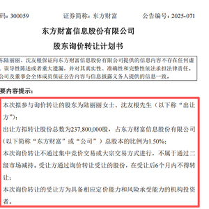 9月30日,东方财富发布公告,公司股东陆丽丽、沈友根拟通过询价转让方式转让2.38亿股股份,仅占公司总股本的1.50%。
