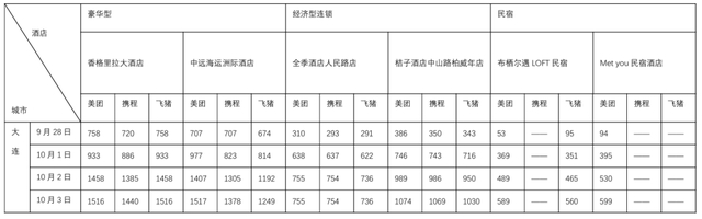 9月28日至国庆假期前三天十大热门旅游城市部分酒店价格对比: