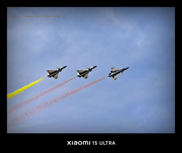 在航展拍摄过程中,小米15 Ultra的多焦段组合十分实用,广角镜头可以用于拍摄地面展示机型的整体外观,70mm长焦镜头可以用于拍摄空中编队飞行,100mm长焦镜头可以用于拍摄单机特写,通过裁切实现的400mm焦段也十分适合拍摄飞行特写。