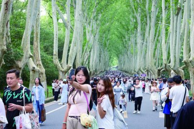 昨天是钟山风景名胜区交通优化提升首日,本报记者实地探访,长假首日景区迎来八方游客,在多部门通力协作守护下,景区内外交通秩序井然,市民游客出行文明有序。图为全国各地游客在陵园路步行道打卡留影。 南京日报/紫金山新闻记者 段仁虎