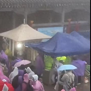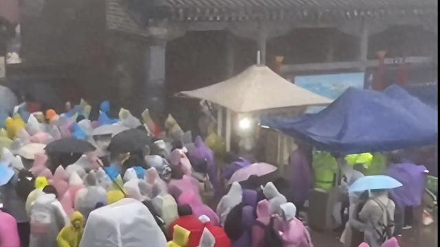 国庆期间,游客登泰山时遇到大雨天,不少人躲在厕所避雨(视频截图)