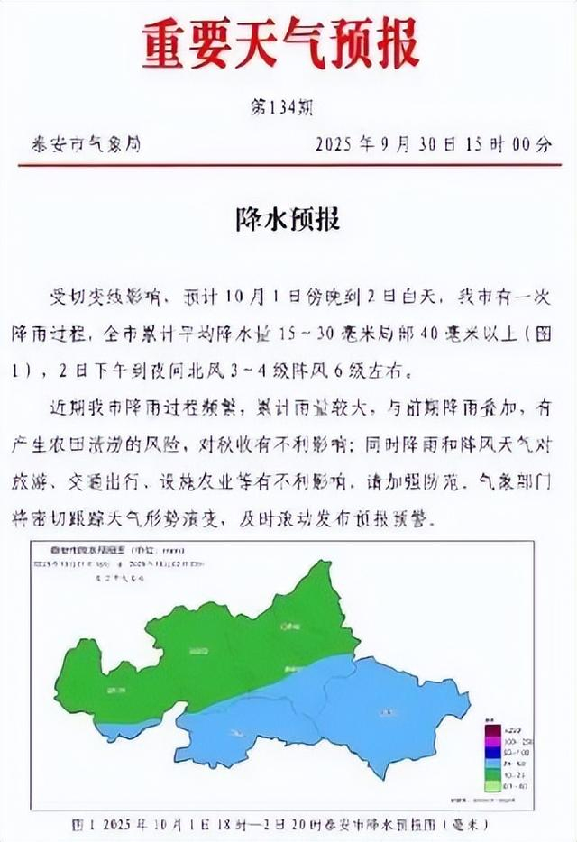 9月30日15时,泰安市气象局发布降水预报:受切变线影响,预计10月1日傍晚到2日白天,我市有一次降雨过程,全市累计平均降水量15~30毫米局部40毫米以上,2日下午到夜间北风3~4级阵风6级左右。