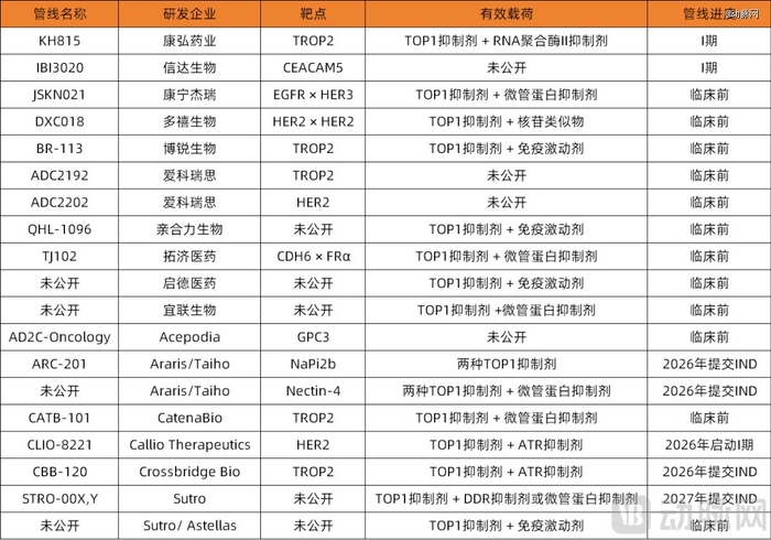 其中,中国药企康弘药业的KH815和信达生物的IBI3020,是目前全球公开范围内仅有的、获批IND的两款双载荷ADC管线。