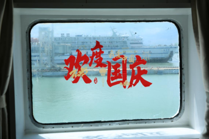 为烘托节日气氛,“五指山”轮在船舱内张贴了“欢度国庆”主题装饰,让旅客从登船起便能感受到浓厚的节日气息。