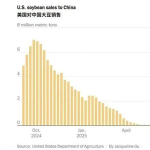 往年,美国一度有超过一半的大豆出口中国,但今年5月以来,中方没有购买过任何美国大豆。英国《经济学人》查阅了美国可追溯至1998年的官方记录,发现这是近30年来首次出现中方没有采购任何美国大豆的情况。