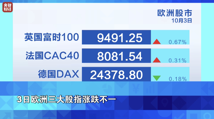 本周五,欧洲三大股指涨跌不一,截至收盘,英国富时100指数涨0.67%,法国CAC40指数涨0.31%,德国DAX指数跌0.18%。