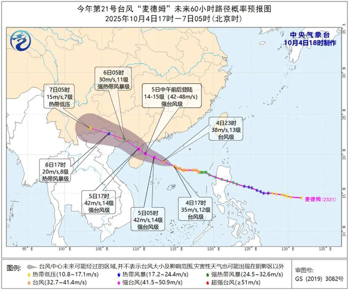 预计,“麦德姆”将逐渐向广东西部到海南岛东部一带沿海靠近,并将于5日中午前后在广东电白至海南琼海一带沿海登陆(强台风级,14-15级,42-48米/秒),登陆后强度逐渐减弱。