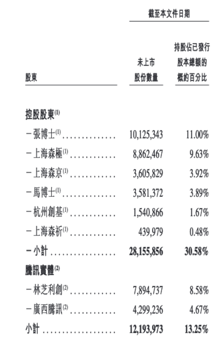 根据招股书,自2017年起至2024年,该公司完成多轮融资,包括天使轮、Pre-A轮至F轮。股权结构方面,森亿医疗创始团队为核心持股方,包括董事长兼CEO张少典博士、联合创始人马汉东博士、以及上海森极、上海森京、杭州创基、上海森祈等员工持股平台,合计持股比例在IPO前约30.58%。领航资深独立投资者包括腾讯实体(林芝利创+广西腾讯)、珠海慧亿(IDG资本关联方)、红杉铭德等,其中,腾讯实体持股13.25%,珠海慧亿持股11.28%,红杉铭德持股11.23%,均为IPO前已投资超12个月的长期资本。