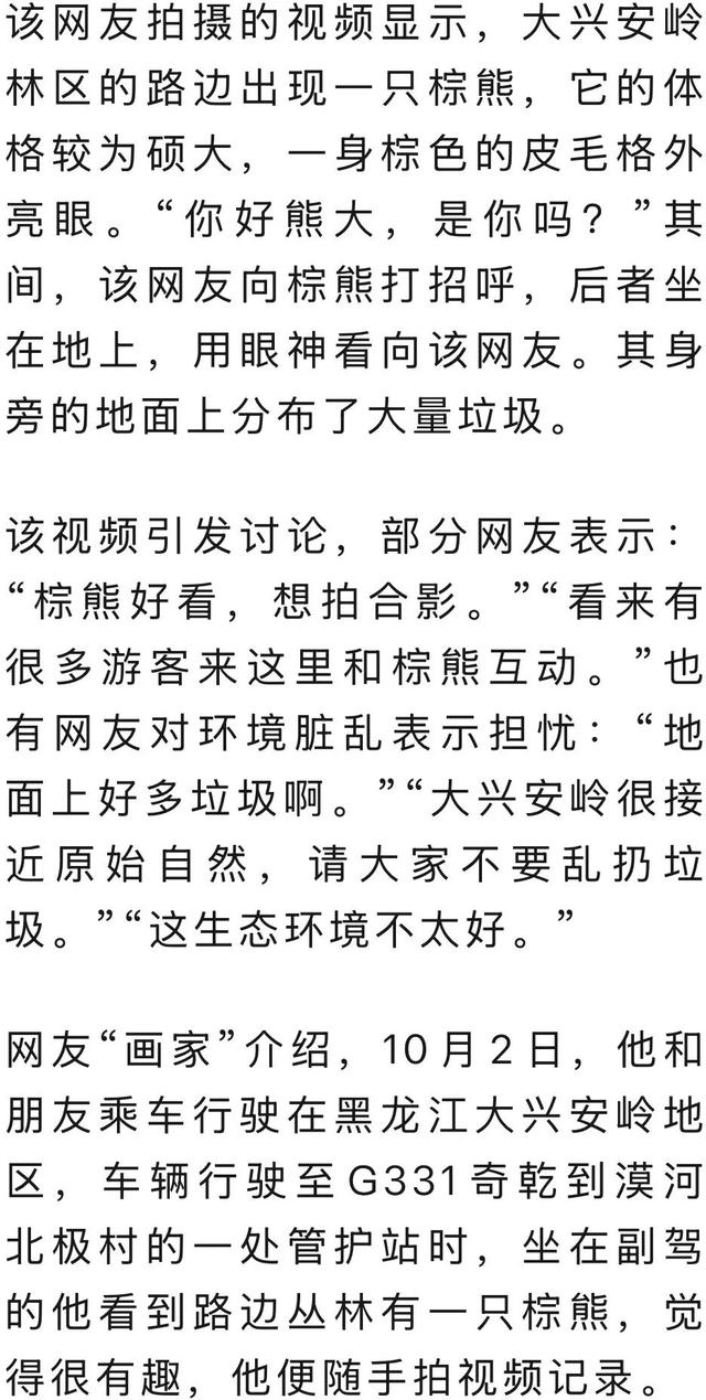 男子在大兴安岭林区偶遇野生棕熊,附近垃圾成片被吐槽,当事人:已有人员打扫