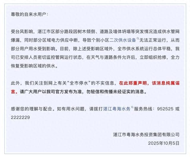 10月5日晚间,湛江市粤海水务投资集团有限公司通过“网信湛江”公众号发布郑重声明称,此前网络上有关“全市停水”的信息不实,纯属谣言。