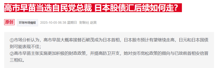 消息面上,日本前经济安全保障担当大臣高市早苗在上周六举行的日本自民党总裁选举中胜出,由此成为自民党首位女总裁,并有望成为日本首位女首相。