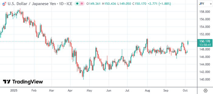 与此同时,日元汇率明显走低。美元兑日元升破150这一关键心理关口,现报150.16,涨幅超过1.8%,日内一度涨至150.43,是8月初以来的最高水平。