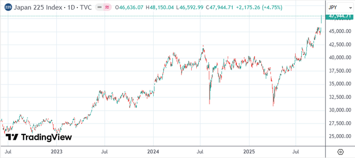 具体行情显示,日经225种股票平均价格指数收盘上涨4.75%报47944.76点,刷新历史纪录,上一次录得这样的单日涨幅还是在4月10日。盘中该指数一度涨破48000关口。