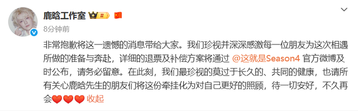 非常抱歉将这一遗憾的消息带给大家。我们珍视并深深感激每一位朋友为这次相遇所做的准备与奔赴,详细的退票及补偿方案将及时公布,请务必留意。在此刻,我们最珍视的莫过于长久的、共同的健康,也请所有关心鹿晗先生的朋友们将这份牵挂化为对自己更好的照顾,待一切安好,不久再会。