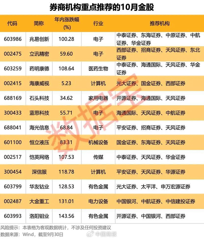 当前,券商10月月度“金股”陆续出炉。Wind数据显示,已有近200只标的入围券商10月“金股”名单。