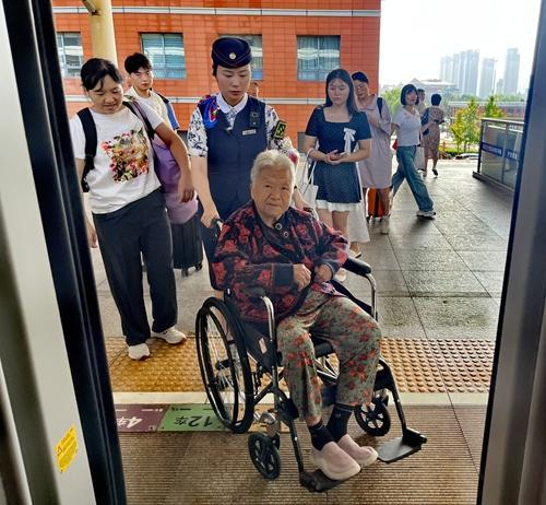 一位年长的香港旅客王婆婆上车时行动不便,“我来帮您。”柏旖旎快步上前接过行李,并为老人系上一个呼叫器,“需要帮助时按一下,我们马上过来”。