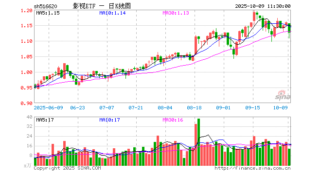 10月9日,截止午间收盘,影视ETF(516620)跌2.93%,报1.125元,成交额1521.86万元。影视ETF(516620)重仓股方面,光线传媒截止午盘跌10.22%,完美世界跌2.66%,芒果超媒跌4.89%,东方明珠跌1.94%,捷成股份涨5.79%,万达电影跌7.64%,华策影视跌12.59%,视觉中国涨10.02%,奥飞娱乐跌0.11%,江苏有线涨0.28%。