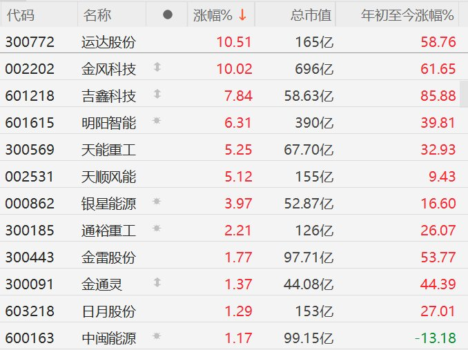 A股风电股走强,金风科技涨停