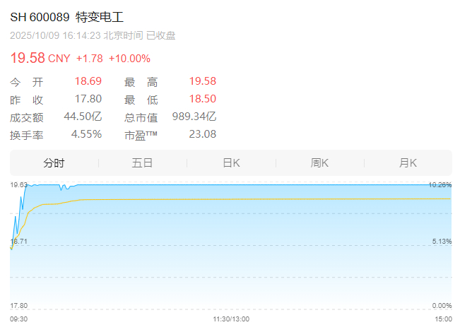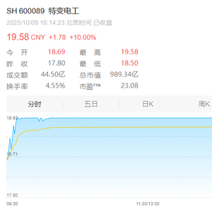 10月9日,特变电工强势上涨10%,股价报19.58元/股,总市值为989.3亿。