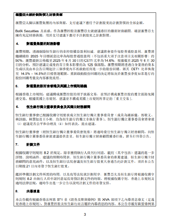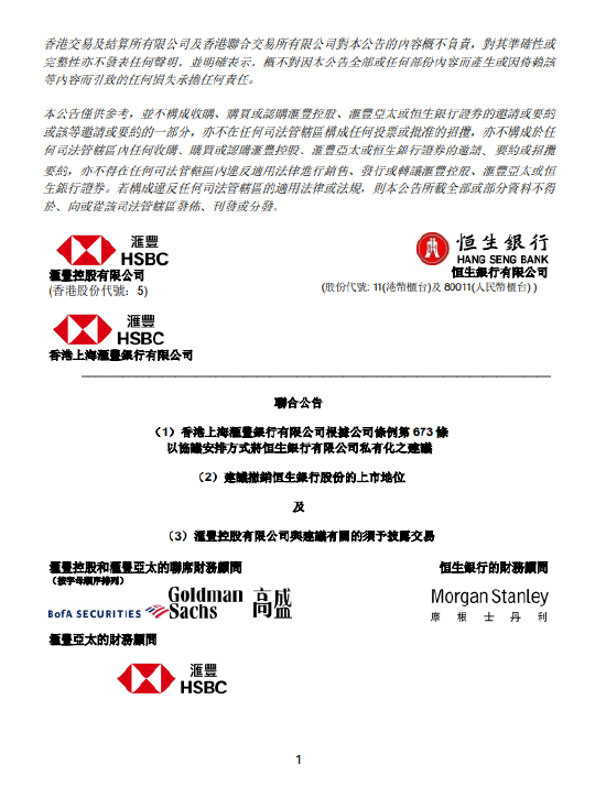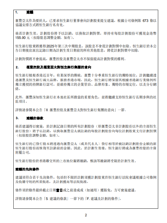 公告显示,汇丰控股、汇丰亚太及恒生银行联合宣布,汇丰亚太作为要约人,已要求恒生银行董事会向股东提呈建议,根据香港特别行政区《公司条例》第673条以协议安排方式将恒生银行私有化。若计划生效,计划股份将予以注销,以换取计划对价,即持有每股计划股份可获现金155.00港元(扣除股息调整金额,如有)。