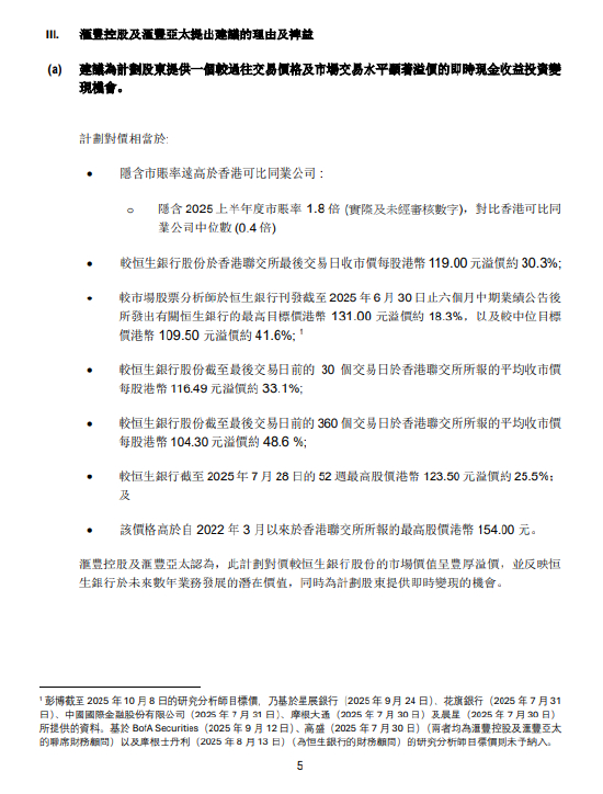 公告还显示,此建议为每股计划股份提供155港元的现金对价,相当于较恒生银行股份于香港联交所最后交易日收市价每股港币119.00元溢价约 30.3%。
