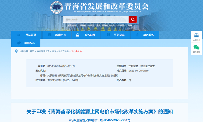 储能与电力市场获悉,近日,青海省发展和改革委员会发布《青海省深化新能源上网电价市场化改革实施方案》正式稿,并随公告发布3份细则文件: