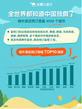 去哪儿数据显示,国庆期间,用户预订了境外4588个城市的酒店。预订量最高的国家是日本,前十中还包括泰国、韩国、马来西亚、越南、印度尼西亚、澳大利亚、俄罗斯、美国、新加坡。