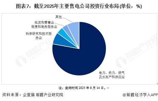 从中国主要售电公司投资行业布局来看,电力、热力、燃气及水生产和供应业占比78%,科学研究和技术服务业占比7%,租赁和商务服务业占比4%,批发和零售业占比3%。