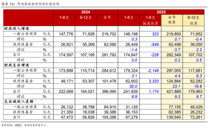 年内财政赤字仍有扩张空间。今年1-8月,一般公共预算收入累计同比增长0.3%,政府性基金预算收入累计同比下降1.4%,两本帐收入合计累计同比持平,基本接近全年预算增速。按照全年预算,9-12月两本帐赤字剩余7.2万亿元空间,比去年同期实际额仍有1.5万亿元增量空间。我们预计,年内可能不会追加预算赤字。但是财政部表示 将“提前下达部分2026年新增地方政府债务限额,靠前使用化债额度”,财政政策力度有可能进一步加大。