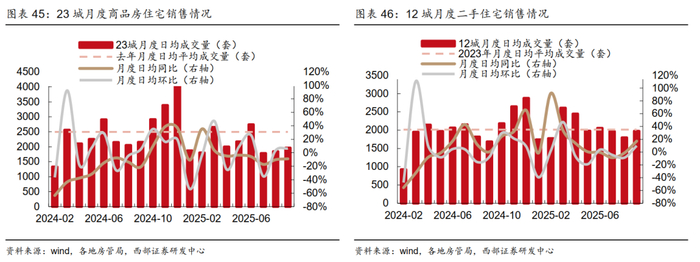 2025W40周度数据:23城商品房住宅销售套数同比-17.1%,环比+12.6%,12城二手房销售套数同比+30.9%,环比-33.6%,受假期调休影响,9月下旬数据存在波动,整体来看新房成交环比持续提升,二手房受假期影响环比回落,由于高频数据主要聚焦核心城市,其中北京、上海、深圳8月以来均有宽松政策出台,高频成交量整体走势向上。