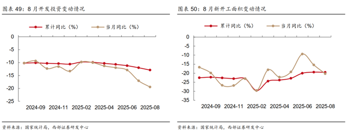 房地产投资、新开工面积同比降幅扩大,竣工面积同比降幅收窄。8月行业开发投资当月同比-19.5%,同比降幅较上月扩大2.4pct。新开工当月同比-20.3%,同比降幅较上月扩大4.8pct;从绝对值看,本月新开工4595万平,为过去3年8月月均水平的63.7%。竣工同比-21.4%,降幅较上月收窄8.0pct;从绝对值看,本月竣工2660万平,为过去3年8月月均水平的59.0%。