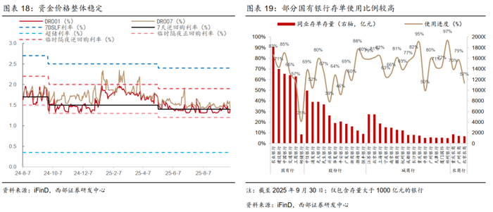央行延续支持性立场,存单结构性提价压力仍在。央行2025年Q3货政委员会例会表述显示货币政策支持性立场未变,在当前债市情绪不稳、基金赎回压力持续的背景下,预计央行将持续呵护流动性,优先使用MLF、买断式逆回购等工具,必要时重启国债买卖、降准等,为市场提供长期限资金,以防止赎回潮等金融市场风险、缓解银行负债压力和净息差压力。不过需要注意的是,防止资金空转仍是央行重点目标之一,若资金价格过低或将触发防空转监管。相较8月末,各银行存单使用进度变化不大,部分国有行存单发行规模和使用进度较高,结构性提价压力仍在。