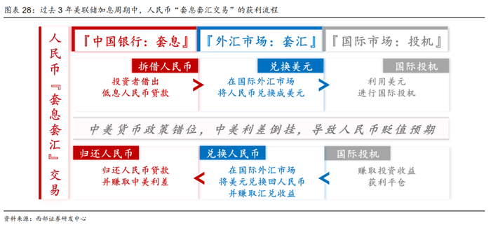 过去3年美联储加息周期大量的“套息套汇交易”将在降息周期迎来反转。过去3年美债利率明显高于中债,这会滋长“套息套汇交易”:低息借入人民币贷款投资美元资产,赚取中美利差+汇兑收益。一旦美联储开启降息周期,而中国政策利率仍相对偏紧,中美利差倒挂收窄,人民币汇率升值,将导致“套息套汇交易”反转,跨境资本回流中国。