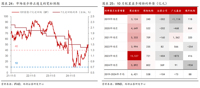 国庆假期数据对债市整体中性,展望10月:1)资金面来看,当前债市情绪不稳、基金赎回压力持续,预计央行将持续呵护流动性,同时防止资金空转,部分国有行存单发行规模和使用进度较高,结构性提价压力仍在;2)权益市场大涨、债市回调后,权益相对国债的风险溢价整体降低,长端、超长端国债利率相对于贷款利率性价比有所提升,30Y国债活跃券与10Y国债活跃券利差升至2023年以来75%分位数以上,纯债资产配置性价比提升;3)债市正逐步修正过度透支的宽松预期,不过整体看广谱利率水平仍较低,顺畅下行难度增加,纯债资产赚钱效应下降,且Q4宽信用政策预期抬升、政策事件扰动较多,债市或将保持震荡偏弱运行,建议以防御为主,票息策略更优、在交易中适当控制久期水平,把握超跌反弹的交易机会;品种上建议配置存单、短利率债。