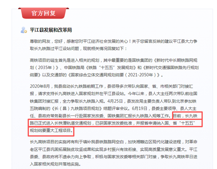 9月5日,平江县发展和改革局在《问政湖南》栏目中的公开回复,截至当时,长九高铁已正式纳入长株潭轨道交通规划,并且成功获得国家发改委批准。这一消息无疑给期待这条高铁已久的沿线群众和地方政府吃下了一颗“定心丸”,也为项目后续的推进奠定了坚实基础。