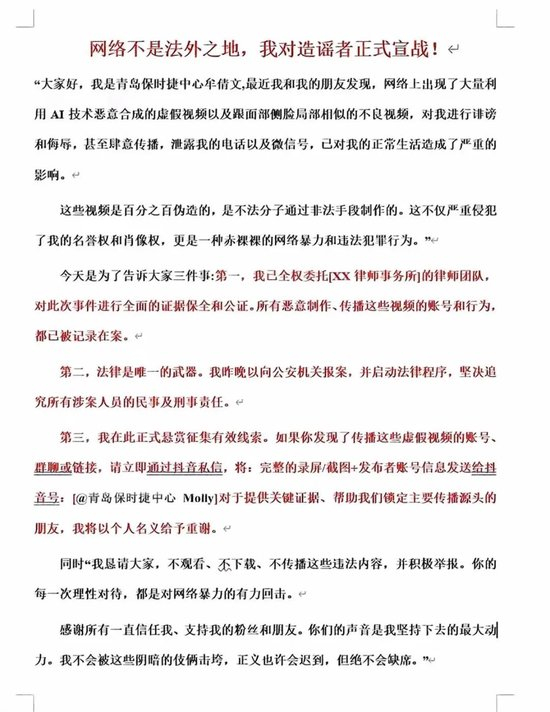 文中称,这些视频是百分之百伪造的,由不法分子通过非法手段制作。她已委托律师团队,对此次事件进行证据保全和公证。
